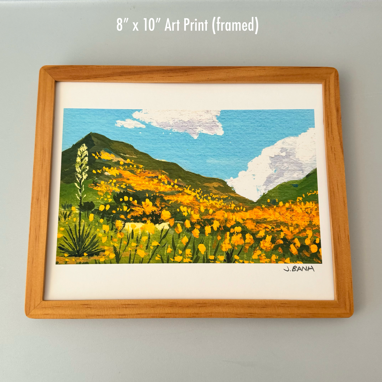 This is a high quality print of a gouache painting I did of the beautiful field of flowers in the hills of the Antelope Valley California Poppies Reserve